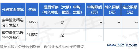 本站消息天美配资,4月23日富荣基金管理有限公司发布《富荣量化精选混合型发起式证券投资基金暂停申购、转换转入、定期定额投资业务的公告》。公告中提示,为保护基金份额持有人利益,自2025年4月23日起富荣量化精选混合型发起式证券投资基金暂停申购、转换转入、定期定额投资业务,下属分级基金调整明细如下: